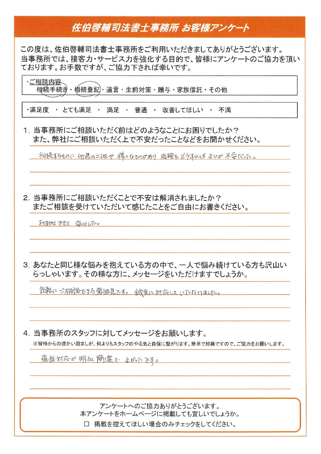 相続するものに他県の土地や様々なものがあり、処理をどうすればよいか不安だった。